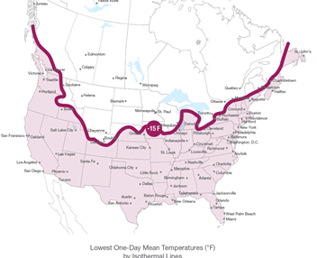 freezemaster™ antifreeze’s minimum use temperature of -12ºF (-24ºC) makes it suitable for unlimited exterior uses in buildings in most areas of the United States and along the east and west coastal areas of Canada. These regions appear on or below the line in the graphic below, and include these cities and their surrounding areas: